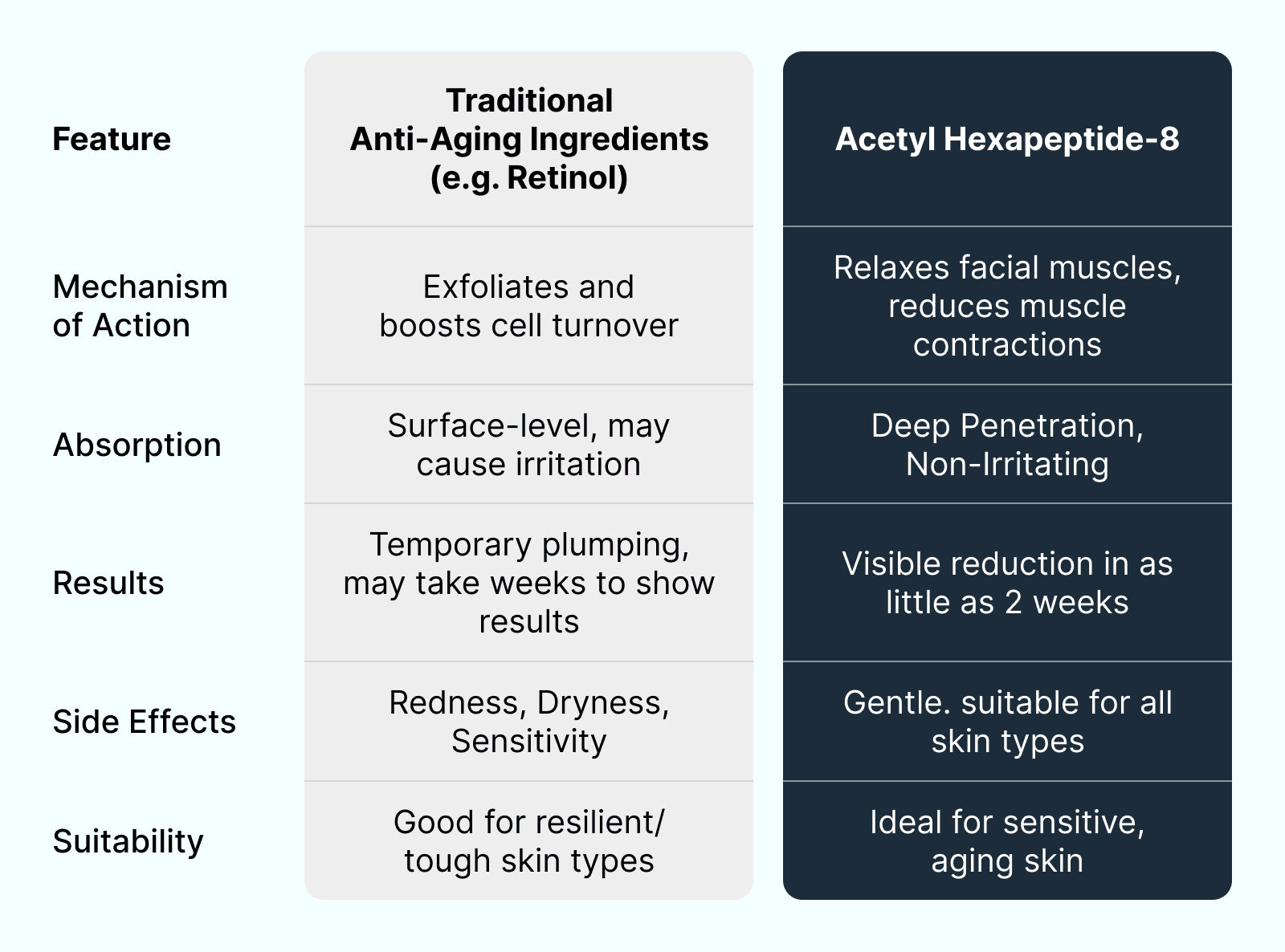 In contrast, Acetyl Hexapeptide-8 works differently. It targets the facial muscles responsible for expression lines, relaxing them gently and reducing the depth and frequency of wrinkles.