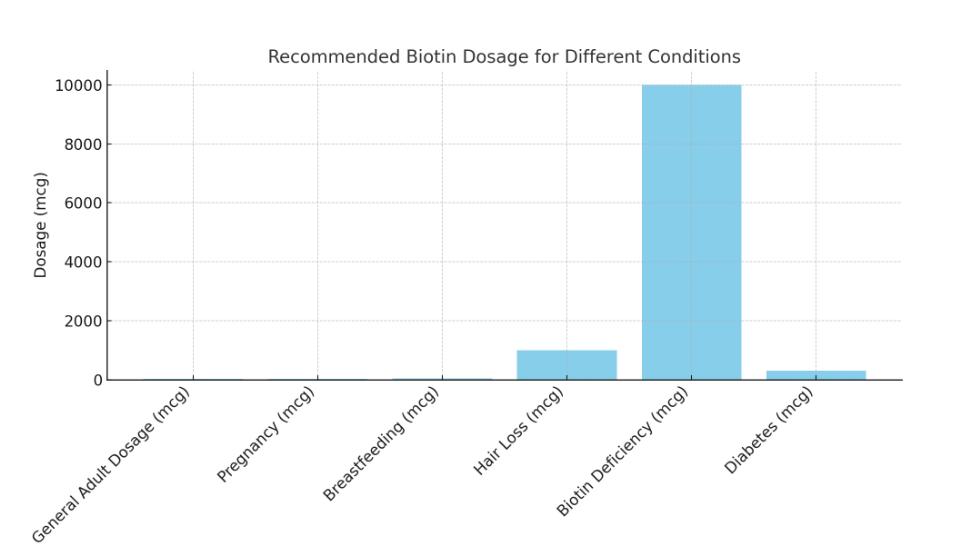4. Biotin Deficiency: In cases of biotin deficiency (which is rare), doses as high as 10,000 mcg per day may be prescribed by a healthcare provider. Symptoms of deficiency include hair loss, brittle nails, and skin rashes.