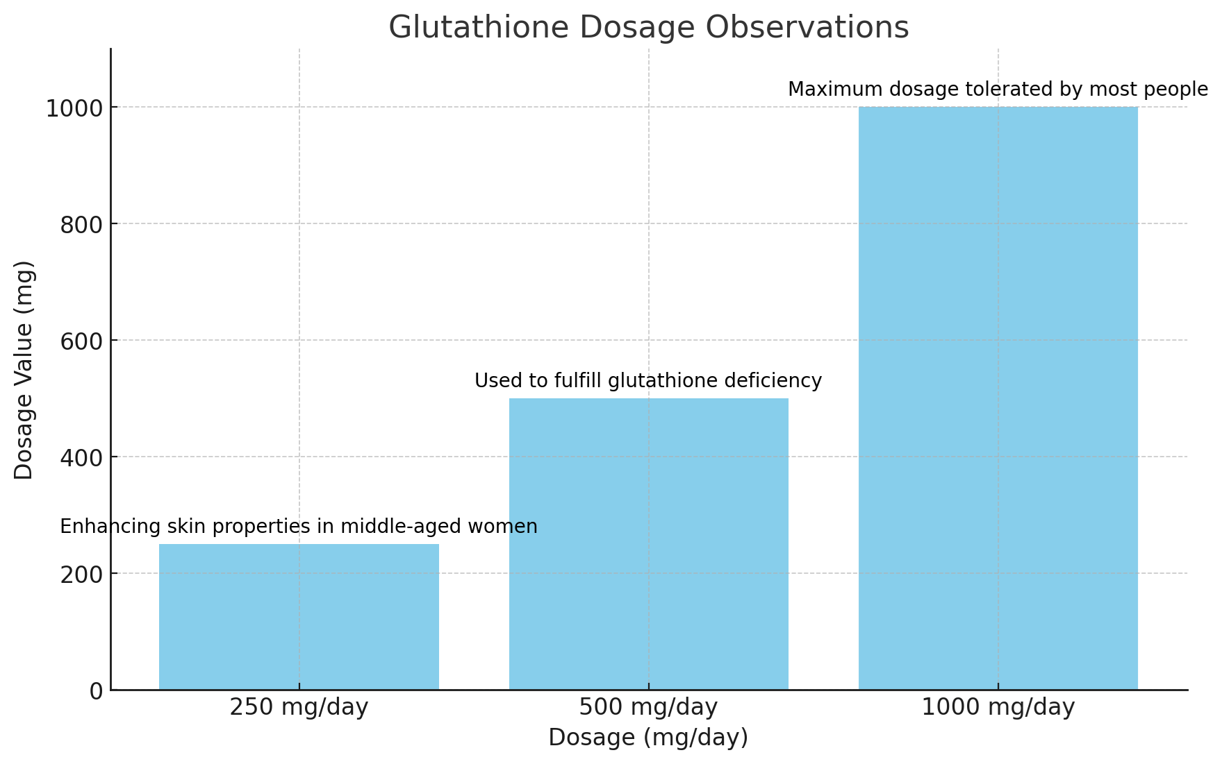 Studies show that any range between 250 to 1000 mg per day is well tolerated by most people. In case someone has a deficiency of Glutathione, he may take 500 mg of it to fulfill this deficiency[11] However, as per research, it was observed that 250 mg of oxidized and reduced glutathione per day helps in enhancing skin properties in middle-aged women[12]