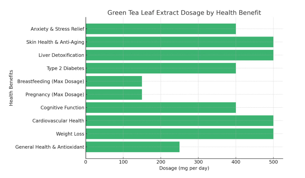 8. Skin Health and Anti-Aging: For skin protection and anti-aging benefits, a daily intake of 250-500 mg of Green Tea Extract is recommended.