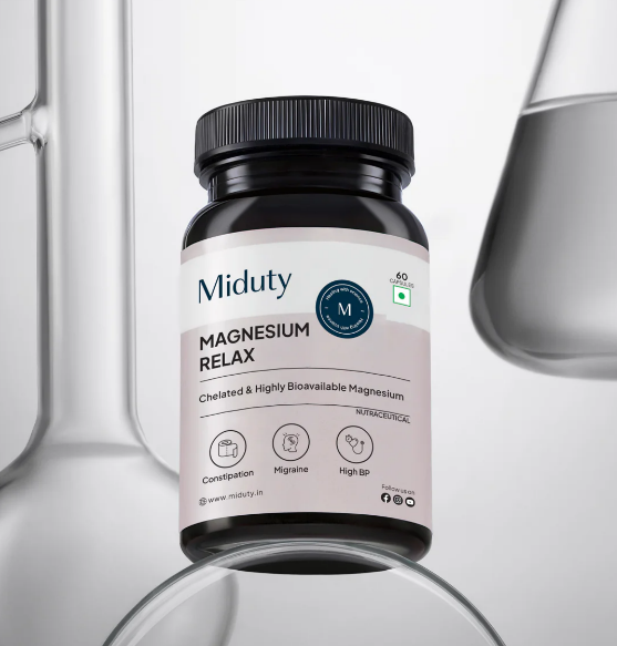 Miduty offers its Magnesium Relax supplement which ensures highest bioavailability and efficient absorption by your body. It has Magnesium bisglycinate and magnesium oxide in it, which meets the optimum magnesium requirements of the body.