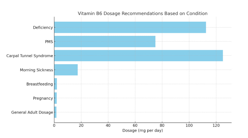 Premenstrual Syndrome (PMS): Dosages of 50-100 mg per day may be recommended to help manage PMS symptoms, but it's important to avoid high doses over extended periods.