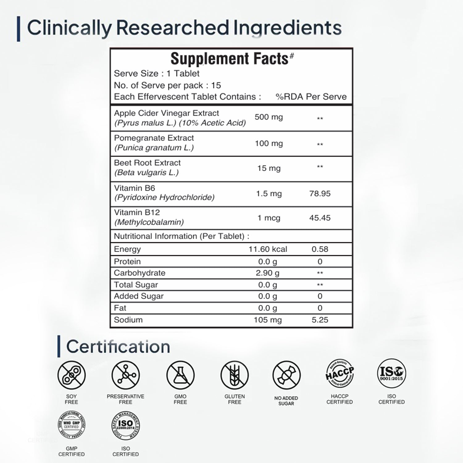ACV effervescent tablets support digestion, metabolism, and detoxification, help balance blood sugar, and may aid in weight management and boosting energy levels, all without the strong taste of liquid vinegar.