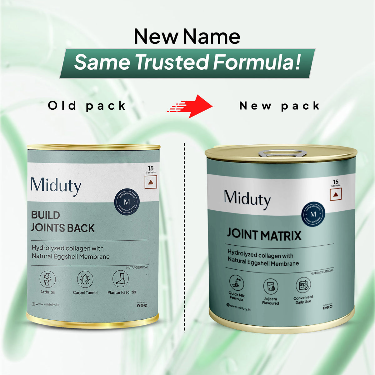 Miduty Joint Matrix is formed with the combination of powerful ingredients: Egg Shell Membrane, Hydrolyzed Collagen, Fish Collagen Peptides, Glucosamine HCL, Chondroitin Sulfate, Boswellia Serrata, and MSM (Methylsulfonylmethane), which may help in Joint pain reduction, cartilage repair, bone density improvement, inflammation reduction, and mobility. Miduty’s Joint Matrix has the hero ingredient Natural EggShell Membrane that may help repair joint and connective tissue disorders.
