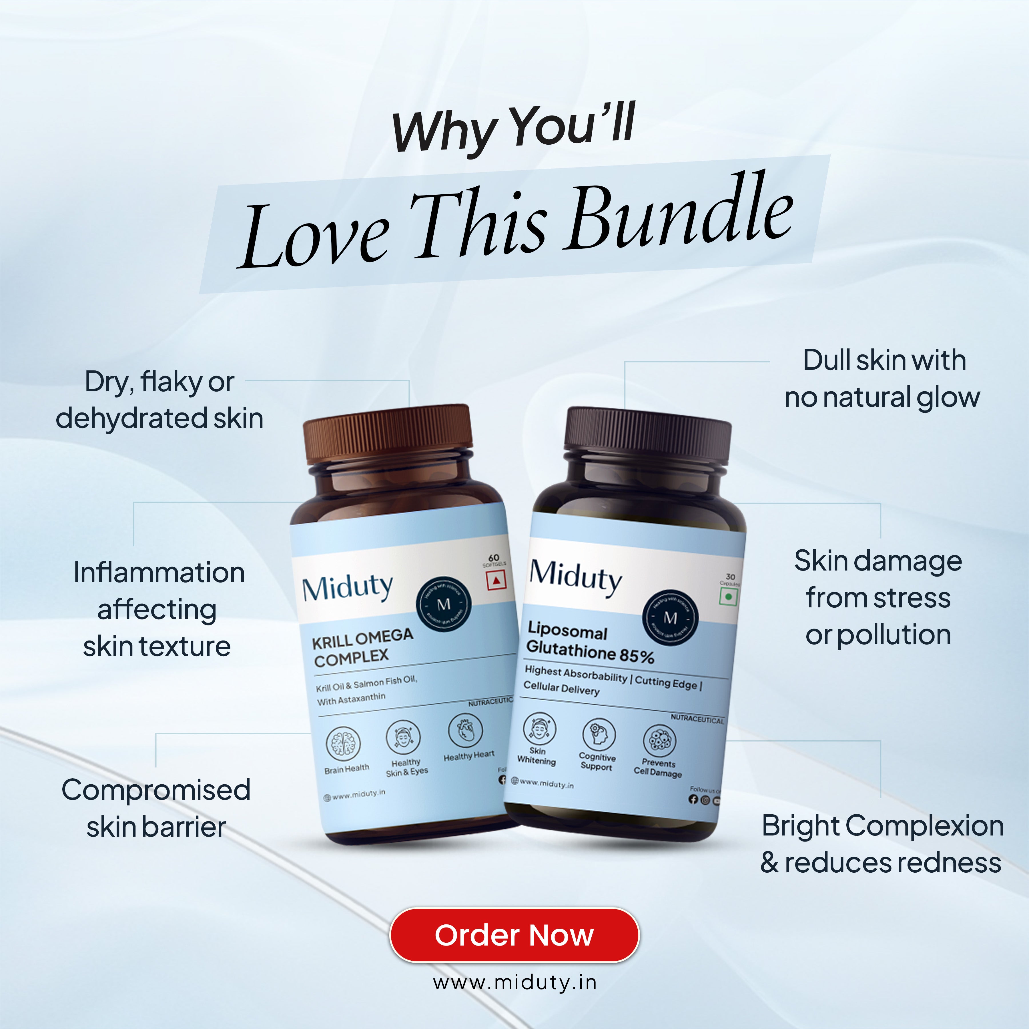 Introducing the Miduty’s Dry Skin & Glow Bundle, the perfect duo to support your overall health, vitality, and youthful glow. Krill Omega is packed with potent omega-3 fatty acids (EPA & DHA) from high-quality krill oil, promoting heart health, cognitive function, and reducing inflammation. Its antioxidant properties also help protect cells from oxidative stress, supporting joint health and boosting energy.