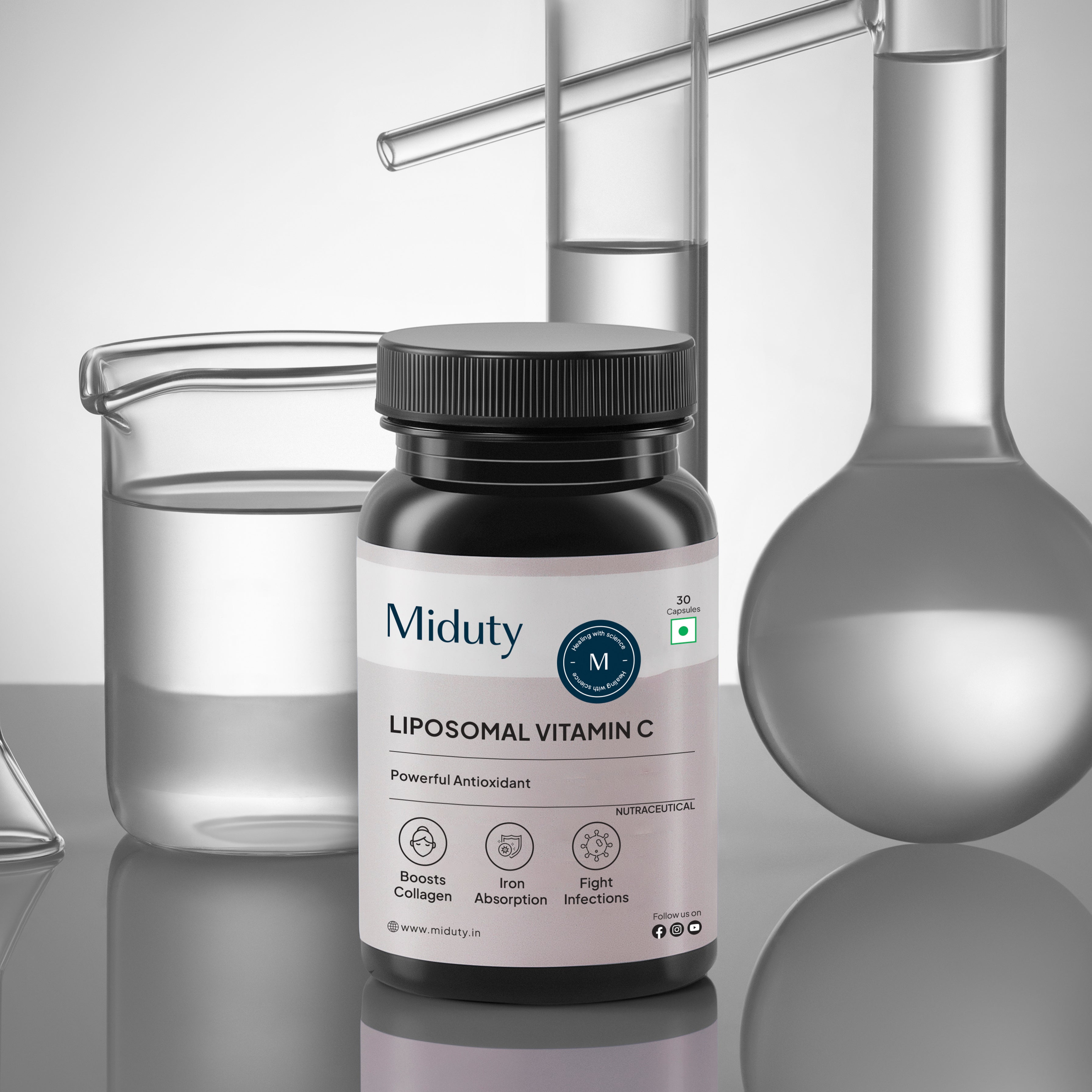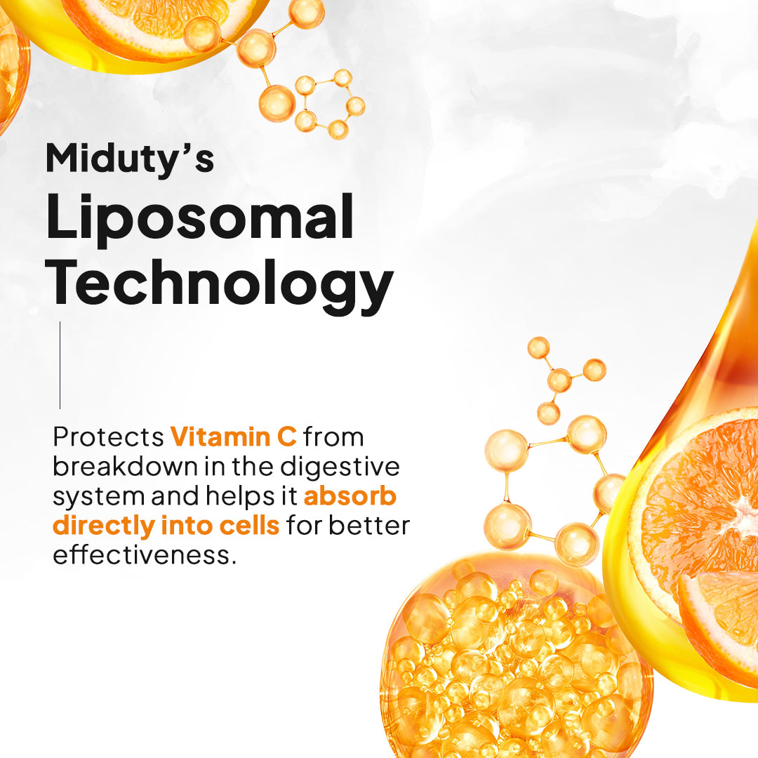 Miduty's Liposomal Vitamin C, with 70% Liposomal Vitamin C and enhanced by Liposomal Technology, offers 16X bioavailability for superior absorption.