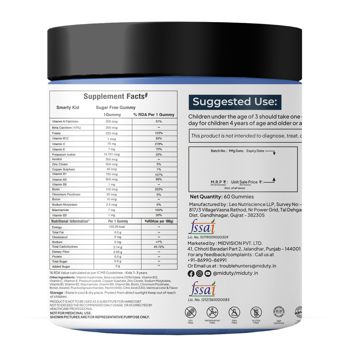 What sets Miduty Smarty Kids apart is that it’s a completely sugar-free gummy. Instead of sugar, it contains Fructooligosaccharides (FOS), that provides a pleasant taste.