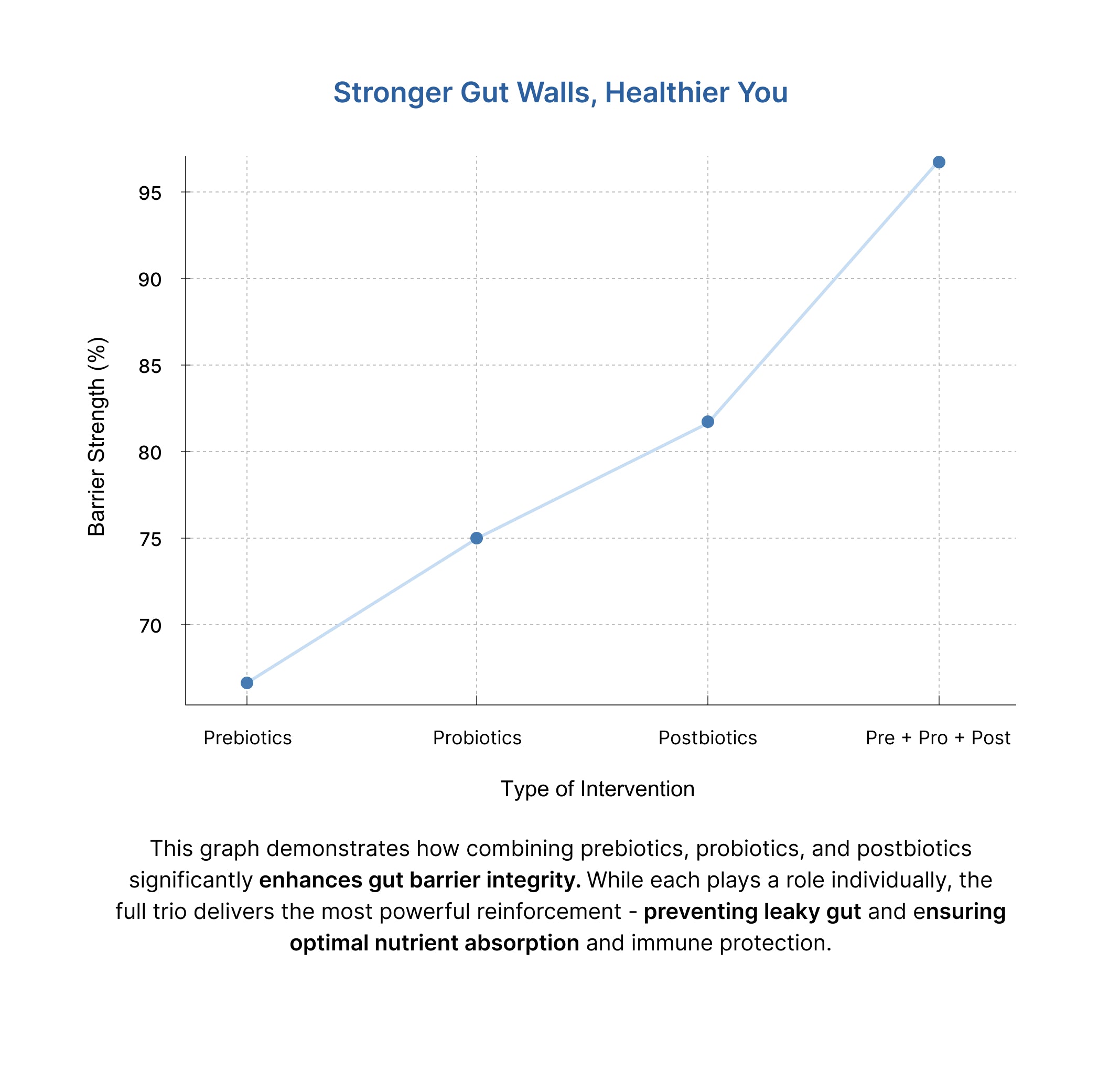 Prebiotics nourish and stimulate the growth of beneficial bacteria, ensuring a healthy environment in the gut. Probiotics recolonize the intestine, crowd out harmful pathogens, and enhance digestion. Postbiotics strengthen the gut barrier, reduce inflammation, and support nutrient absorption.