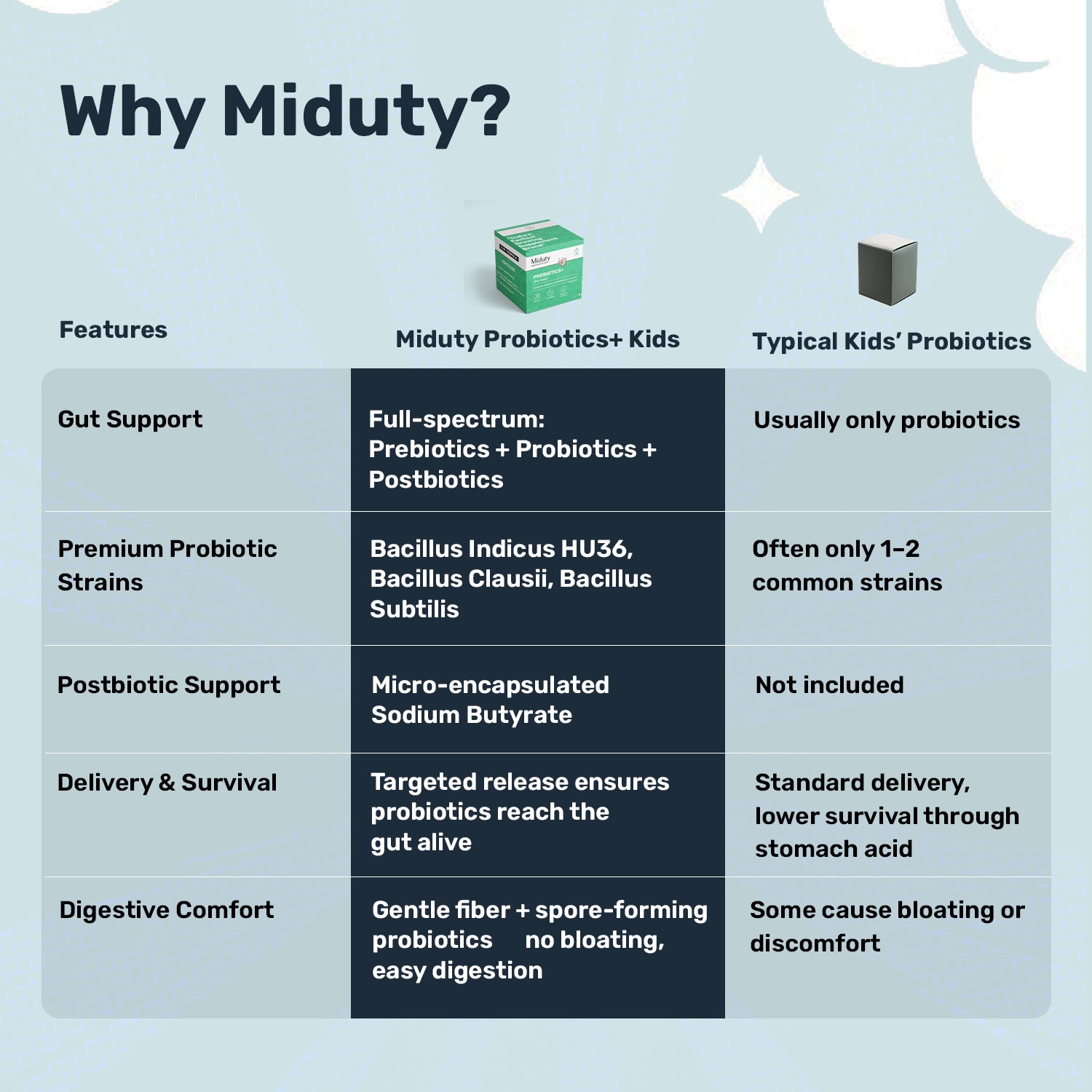 A gut microbiome contains trillions of bacteria, which are essential for digestion, immune function, and barrier protection. Disruptions from infections, antibiotics, or diet can lead to diarrhea, constipation, poor nutrient absorption or children can experience bloating, diarrhea, low immunity, and even mood fluctuations. The goal of Miduty PROBIOTICS+ is to deliver a targeted, safe, and evidence-based probiotic for kids, enhanced with prebiotics and postbiotics, to optimize gut health during growth.
