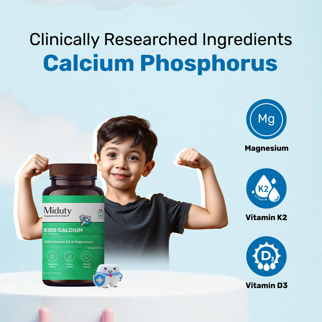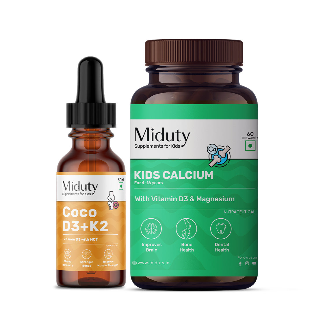 Ensure your child grows strong and healthy with Miduty’s Strong Bones Bundle, combining scientifically formulated Kids Calcium tablets with CoCo D3 + K2 drops. This duo works synergistically to support optimal bone growth, teeth development, and overall immunity in children.