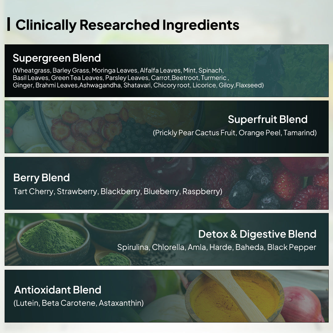 Supergreens are rich in vitamins A, C, K, zinc, chlorophyll, and antioxidants that support immune function and protect against oxidative stress.