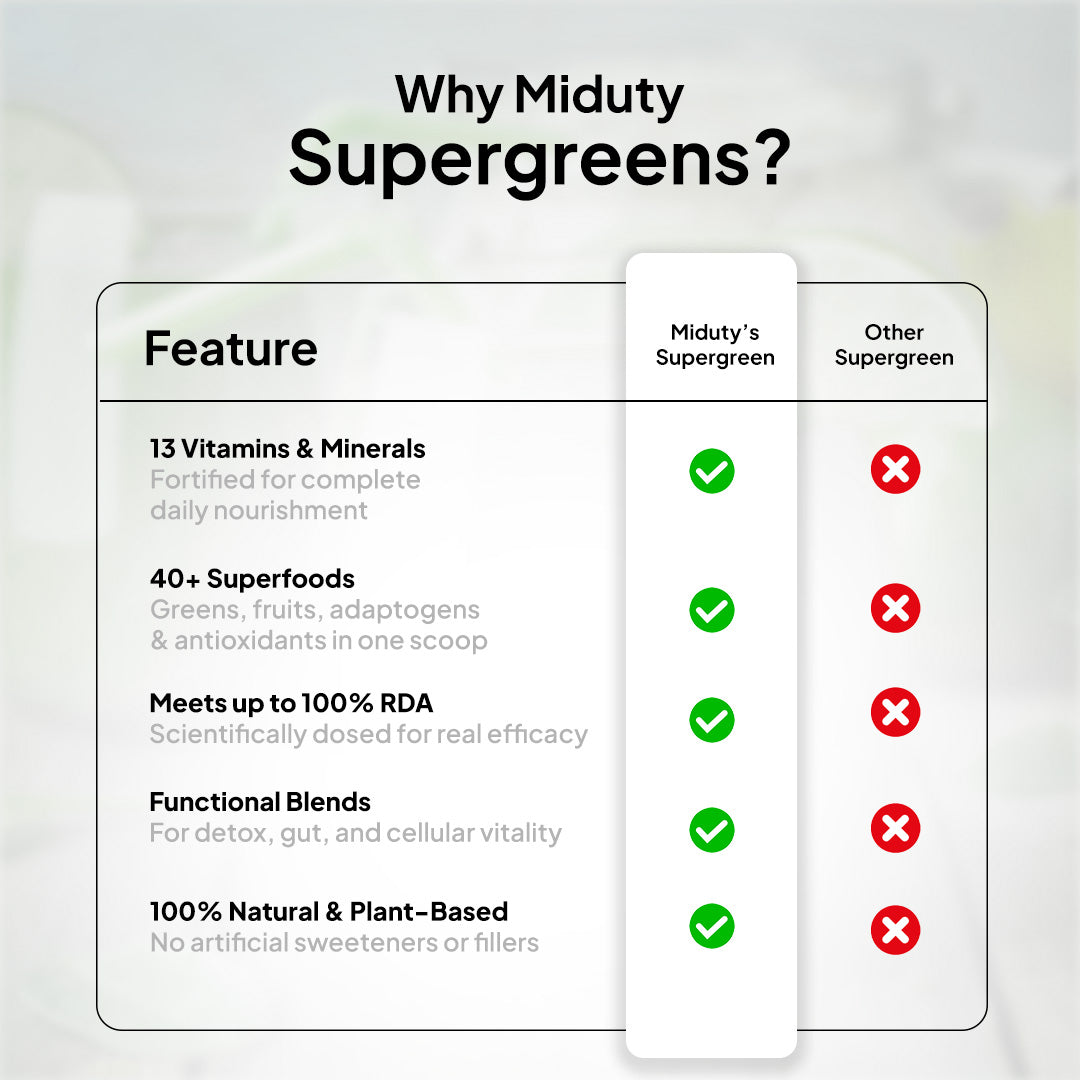 Packed with Moringa leaves, Spirulina, Wheatgrass, Alfalfa, Green Tea leaves, and Green Turmeric, Miduty SuperGreens is your go-to solution for a natural full-body detox. If you often feel low on energy, struggle with acidity, or want to strengthen your immune system, this potent blend of greens has got you covered.